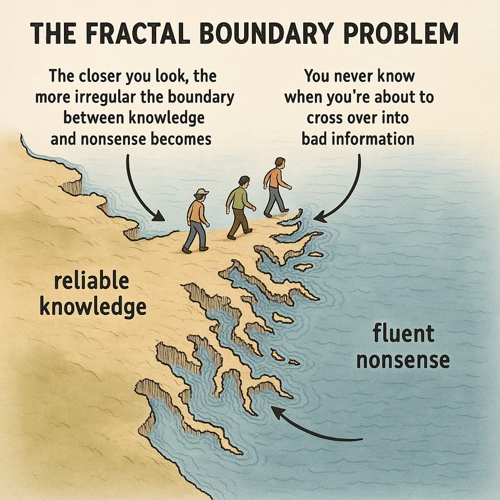 This is the "fractal boundary problem"—the jagged, irregular edge between truth and hallucination in AI systems. Fractals maintain their irregular structure at every level of detail. Zoom out on a coastline: there’s a jagged edge between the water and the land.. Zoom close?Jagged edge. The relationship between the shore and the water is always jagged. Measure by measure, the shore and the sea are always switching places. This maps onto the answers LLM versions of AI give us: be they broad topics or minute specifics, whether you stand in the reliable zone of the shore and the fabricated zone of the sea, the AI maintains the same confident tone throughout. We know the difference, but the AI doesn’t.